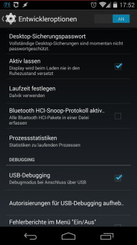 Ok, ganz so einfach ist es dann doch nicht. Im Gerät selbst muss erst noch das Debugging aktiviert werden. Dies passiert unter „Entwickleroptionen“ in den Einstellungen. Bei neueren Android Versionen (>4.2) ist diese Option jedoch versteckt und muss durch einen kleinen Trick erst sichtbar gemacht werden. In Einstellungen ⇒ Über das Telefon tippe man 7 mal auf Build-Nummer, danach findet man direkt über dem Eintrag Über das Telefon die Entwickleroptionen, dort muss nun der Haken unter USB-Debugging gesetzt und zuvor natürlich die Optionen auch aktiviert werden.