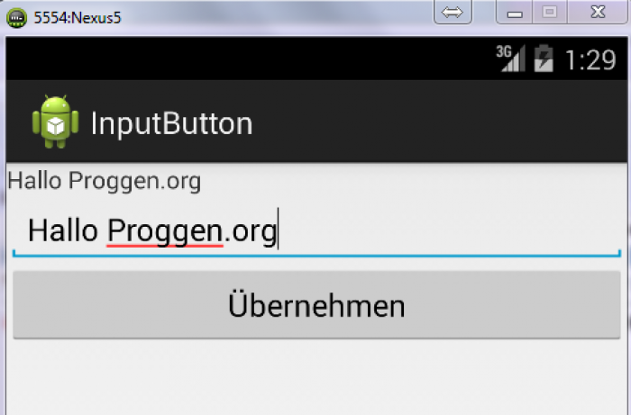In der MainActivity-Klasse werden 3 Felder deklariert, mit deren Hilfe die 3 Elemente für Anzeige, Eingabe und Button benannt werden können. In der Methode onCreate gleich nach dem bereits vorhandenen Code, werden diese 3 Felder mit den Entsprechenden View-Elementen aus dem Layout initialisiert. Das Event onClick welches vom Button ausgelöst wird muss abgefangen werden. Dies passiert mit hilfe des onClickListeners, welcher direkt inline beschrieben wird. Innerhalb des Listeners wird in der Methode onClick das EIngabefeld ausgelsen und der Wert an die textanzeige übergeben.