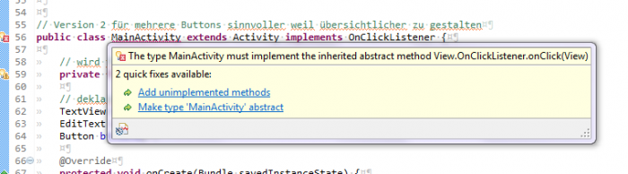 Dann bemängelt Eclipse von sich aus die fehlende Methode, was an der roten Unterstreichung des Klassennamens (MainActivity) zu sehen ist. Bewegt man nun die Maus über das unterstrichene Wort, öffnet sich ein Fenster und Eclipse schlägt unter anderem vor die fehlende Methode hinzuzufügen.