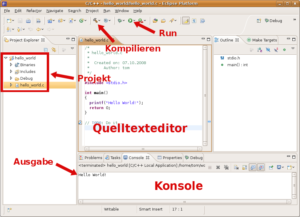 Jetzt speichern wir noch die Datei mit 'File→Save' oder [ctrl]+[c], kompilieren es mit einem Klick auf das Symbol zum Kompilieren oder über den Menüeintrag 'Project→Build Project'. Anschließen können wir das Programm noch starten und zwar mit einem Klick auf das 'Run'-Symbol mit [ctrl]+[F11] oder über 'Run→Run'. Wenn alles funktioniert hat, sollten wir in der Konsole (Fenster unten) die Ausgabe unseres Programms bewundern können.