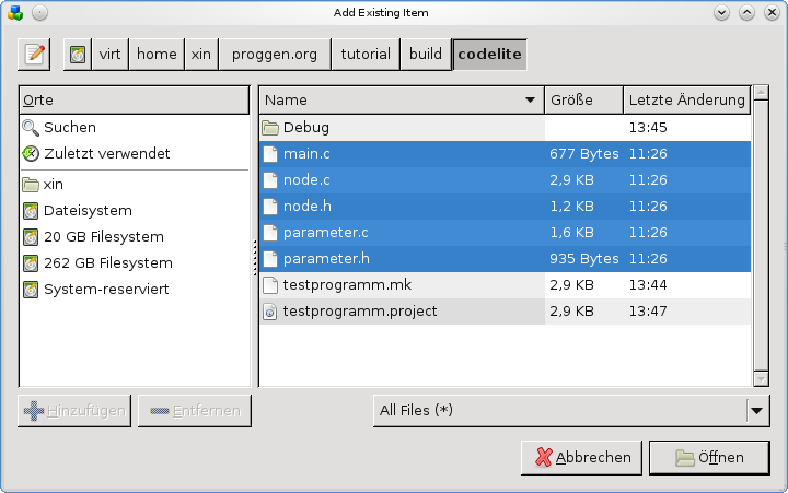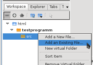 Mit einem Rechtsklick löschen wir main.c aus dem Projekt. Da wir bereits die main.c, node.c/-.h und parameter.c/-.h haben kopieren diese Dateien einfach in das Projektverzeichnis. Mit einem Rechtsklick auf das Projekt im „Workspace View“ können wir 'existierende Dateien hinzufügen' wählen: