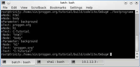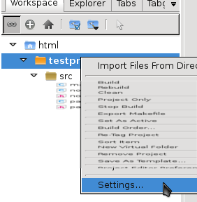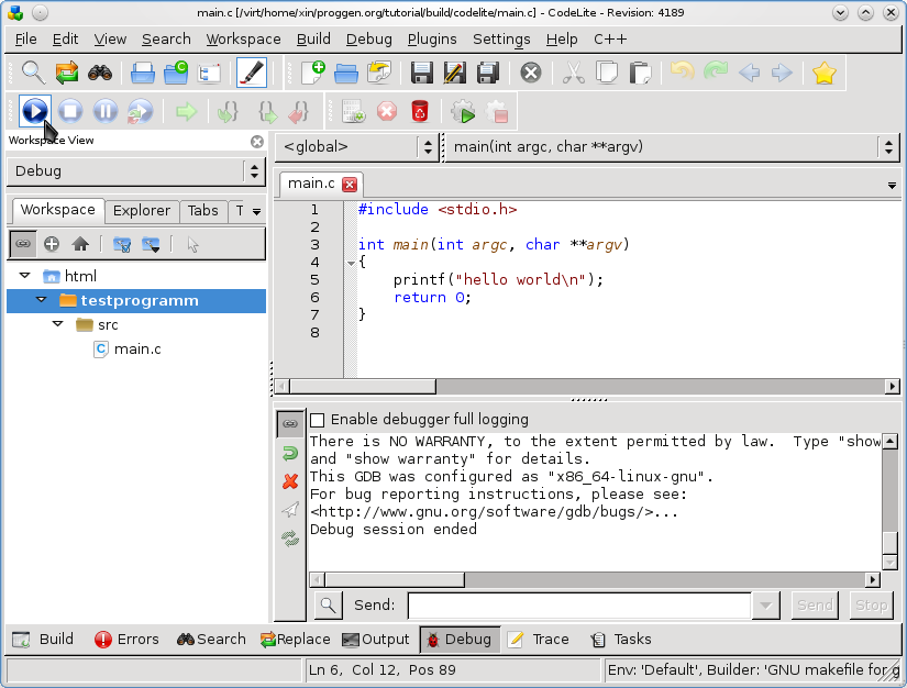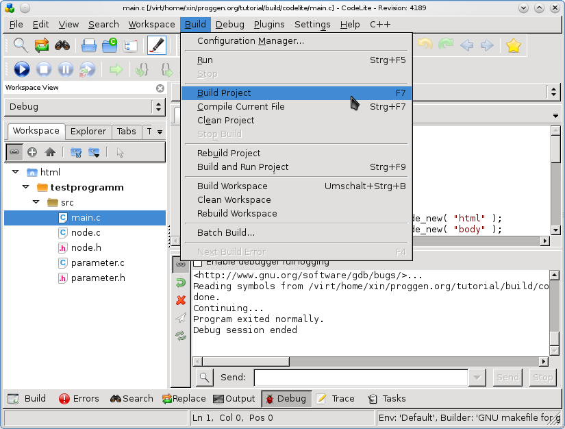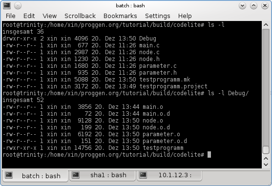 Im Projektverzeichnis findet sich nun eine Datei testprogramm.mk. Das ist ein von Codelite automatisch erzeugtes Makefile.