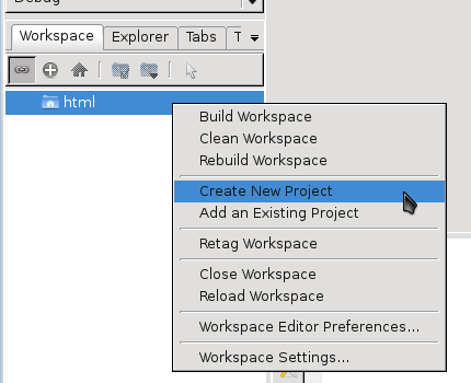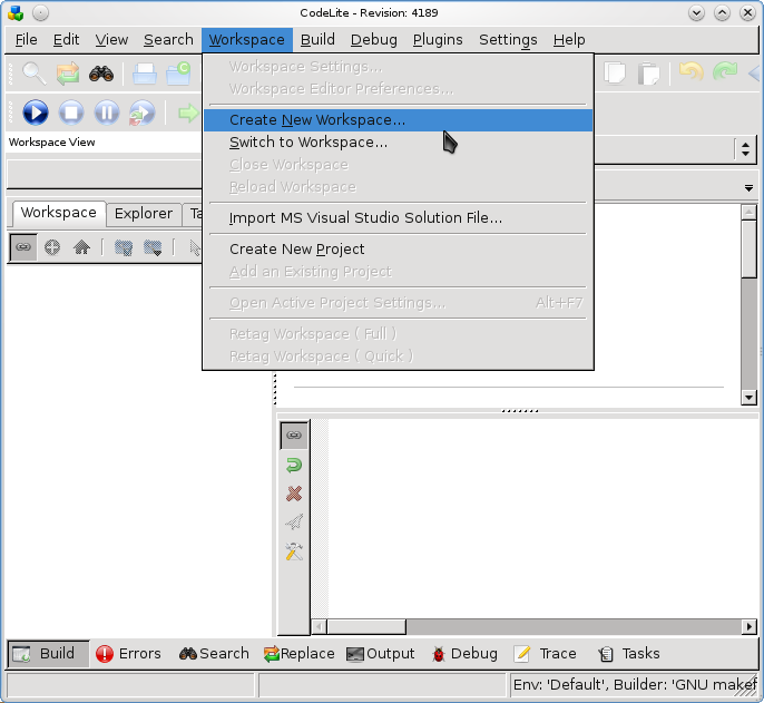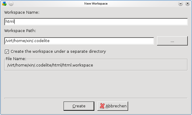Größere Software besteht häufig aus mehreren Programmen. Diese Programmverwaltung nennt sich bei Codelite „Workspace“, wir müssen also zunächst einen Workspace anlegen: