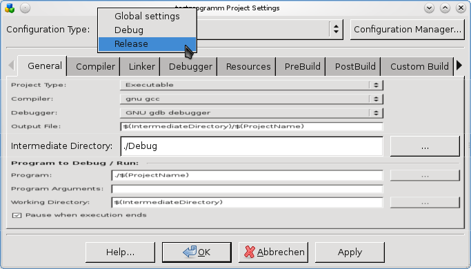Entwicklungsumgebung unterscheiden meistens zwischen unterschiedlichen Build-Vorgängen für verschiedene Programmversionen. In der Regel eine Version zum Debuggen und eine sogenannte Release-Version. Die Release-Version ist das fertige Produkt, dass hochoptimiert laufen soll. Der Buildvorgang soll also hochoptimiert verlaufen und darf keine Debug-Informationen enthalten. Die Debugversion soll nicht optimiert kompiliert werden (das spart Zeit) und zusätzliche Informationen enthalten, die bei der Fehlersuche helfen sollen.