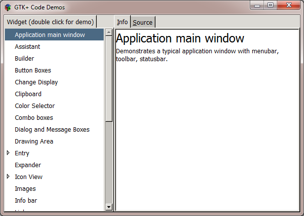 'gtk-demo' ist ein wunderbare Form der Dokumentation. Mit einem Doppelklick auf einen Eintrag der linken Liste geht ein Beispiel auf, auf der rechten Seite sieht man entweder eine Information, was das Beispiel demonstriert und wenn man oben auf auf „Source“ klickt, sieht man den Quelltext, bei dem man sehen kann, wie man das zu programmieren hat.