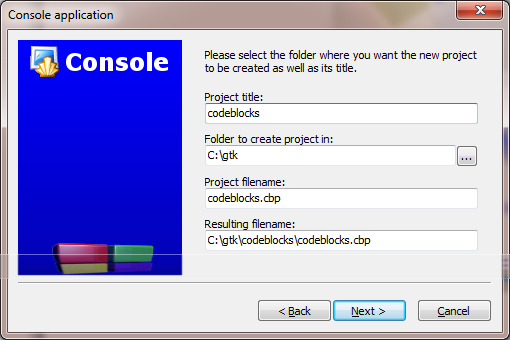 wählen das Konsoleprojekt. Die Auswahl ob C oder C++ ist nicht wirklich wichtig, aber wir programmieren C, also wählen wir es auch. Im Nachfolgenden Dialog konfigurieren wir den Ort, an der wir das Projekt auf die Festplatte legen. Ich habe mir ein Verzeichnis „gtk“ direkt auf dem Laufwerk C: erstellt, indem ich das Projekt 'codeblocks' verwende. Ich verwendete den Namen Codeblocks, weil ich das gleiche Projekt für verschiedene Entwicklungsumgebungen aufziehe. Vielleicht wählt ihr einen sinnvolleren Namen, wie „lib-test“ oder ähnliches.