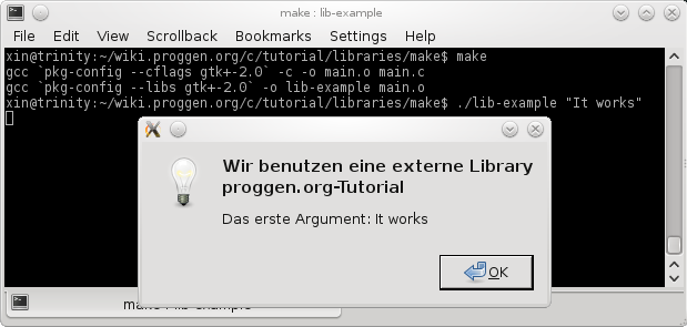 Diese Ausgaben sind im wahrsten Sinne des Wortes für make gemacht. Wir speichern die Ausgaben kurz in den Variablen GTK_LIBS und GTK_FLAGS, in der Variable EXECUTABLE beschreiben wir den Namen der ausführbaren Datei. Für eine genauere Erklärung von Makefiles wirf einen Blick ins Make-Tutorial.