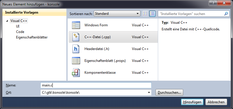 Da wir nur die Main-Funktion schreiben werden, nenne ich die Datei main.c. Hier wird zwar eine .cpp-Datei (C++) angeboten, aber das spielt keine Rolle.