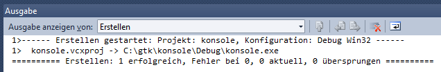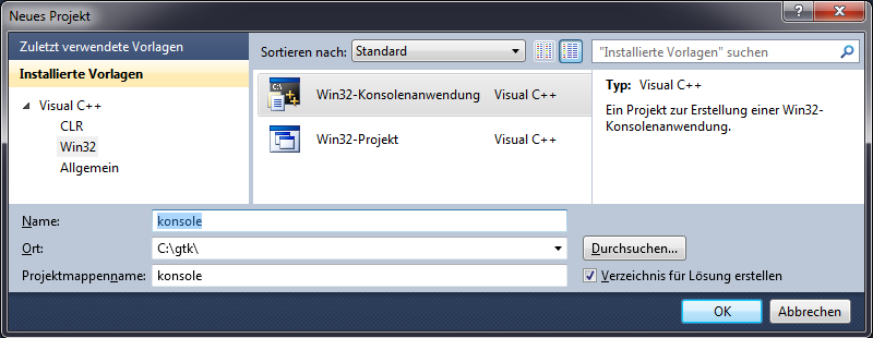 Nachdem wir Visual Studio gestartet legen wir zunächst wieder ein Konsolenprojekt an, wie in der vorherigen Lektion, klicken auf der 2. Seite des Assistenten auf leeres Projekt und anschließend auf Fertig stellen. Ich habe dieses Beispielprogramm auf c:\gtk gelegt, es steht Dir aber frei das Projekt wo immer Du willst abzulegen.