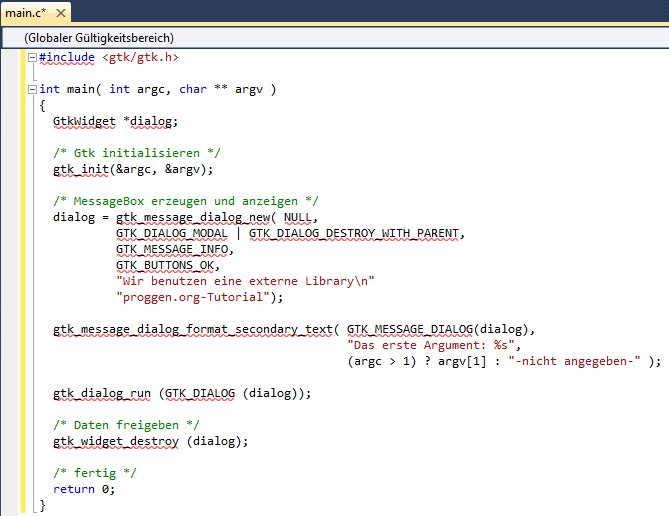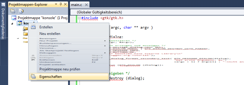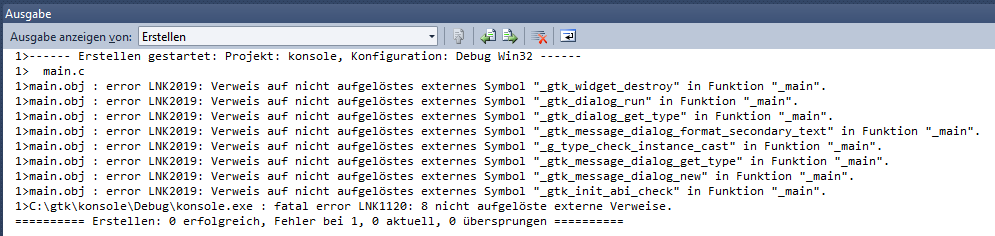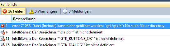In der ersten Zeile der Datei c:\gtk\konsole\konsole\main.c kann er die Datei „gtk/gtk.h“ nicht finden. Wir müssen die Include-Pfade setzen, so dass er das „gtk“-Verzeichnis finden kann.
