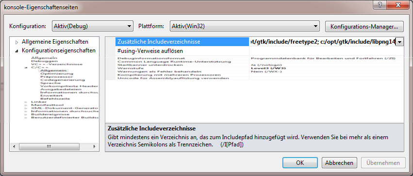Und wählen dort Links „C/C++“ und als Unterpunkt allgemein. In den Punkt „Zusätzliche Includeverzeichnisse“ müssen wir jetzt alle Verzeichnisse eintragen und die einzelnen Pfade mit einem Semikolon trennen. Ich habe die Ausgabe von pkg-config in einen Editor kopiert, die „-I“ entfernt und Semikolons eingefügt und die Pfade so in eine Zeile hintereinander geschrieben. Das kann kann dann in diese eine Zeile einfügen.