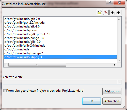 Nun können wir leider nicht einfach nur dieses include-Directory angeben, sondern müssen die Pfade für die einzelnen Libs angeben. Das Verzeichnis für GTK+ liegt zum Beispiel in c:\opt\gtk\include\gtk-2.0.