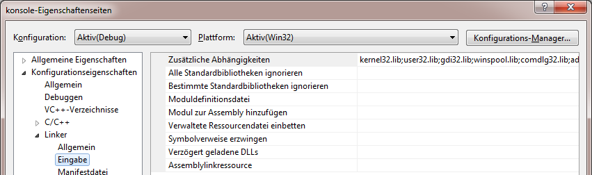 Hierfür rufen wir wieder die Projekteinstellungen auf und wählen diesmal auf der linken Seite „Linker“ und dort „Eingabe“. Auf der rechten Seite finden wir nun „Zusätzliche Abhängigkeiten“: