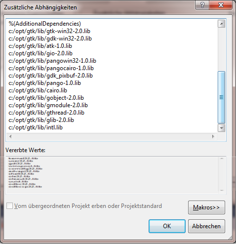 Wenn ihr eure Libs unter c:\opt\gtk\lib habt sollte diese Zeile funktionieren: c:/opt/gtk/lib/gtk-win32-2.0.lib;c:/opt/gtk/lib/gdk-win32-2.0.lib;c:/opt/gtk/lib/atk-1.0.lib;c:/opt/gtk/lib/gio-2.0.lib;c:/opt/gtk/lib/pangowin32-1.0.lib;c:/opt/gtk/lib/pangocairo-1.0.lib;c:/opt/gtk/lib/gdk_pixbuf-2.0.lib;c:/opt/gtk/lib/pango-1.0.lib;c:/opt/gtk/lib/cairo.lib;c:/opt/gtk/lib/gobject-2.0.lib;c:/opt/gtk/lib/gmodule-2.0.lib;c:/opt/gtk/lib/gthread-2.0.lib;c:/opt/gtk/lib/glib-2.0.lib;c:/opt/gtk/lib/intl.lib.