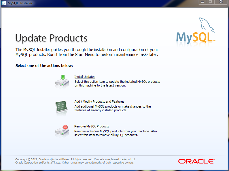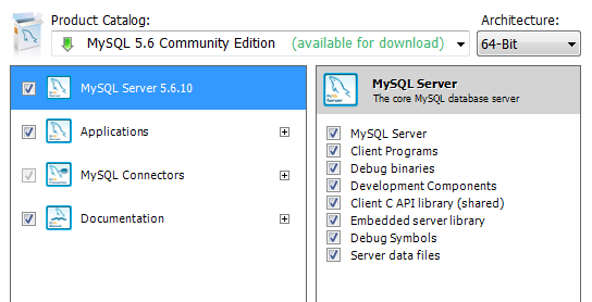 Nun klicken wir auf „Add/Modify Products and Features“ und können die zu installierenden Produkte installieren. Ich empfehle einfach mal nicht zimperlich zu sein und zu installieren, was da ist. Wer kein Office hat, sollte auf „MySQL for Excel“ (unter Applications) verzichten, um Abhängigkeiten zu verringern. Die beiden anderen Apps benötigen .NET 4, was aber auf einer aktuellen Windows-Version vorhanden sein dürfte.