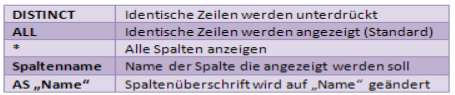 Dinge zwischen „[]“ können geschrieben werden. Bei Argumenten die in „{}“ stehen und mit „|“ getrennt sind muss eines der in Klammer stehenden ausgewählt werden. Für oben würde das bedeuten, dass DISTINCT geschrieben werden kann, aber nicht muss. Es MUSS aber ein „*“ oder mindestens 1 Spaltenname beim SELECT stehn.