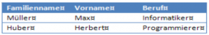 In diesem Beispiel sieht man deutlich, dass die Personennummer und das Essen immer für 2 (oder mehr Personen) gespeichert werden kann. Sitzt jetzt nur eine Person an diesem Tisch, hat man (in unserem Beispiel) 2 NULL Werte. Dies kann verhindert werden indem man sogenannte Wiederholgruppen aufteilt. Jede Gruppe wird in eine neue Zeile umgewandelt.