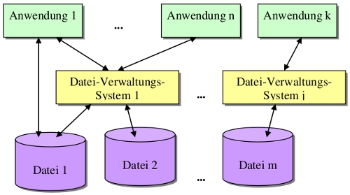 Der nächste Schritt war es, die Dateien durch ein Dateiverwaltungssystem verwalten zu lassen. Dabei hat man nicht direkt auf die Daten zugegriffen sondern über ein Dateiverwaltungssystem. Dieses hat einem dann einfach die Datei zu Verfügung gestellt.