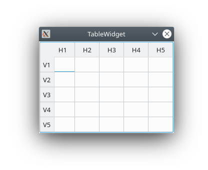 #include <QApplication> #include <QTableWidget> #include <QHeaderView> int main( int argc, char *argv[] ) { QApplication app( argc, argv ); QTableWidget table; // Größe festlegen table.setRowCount( 5 ); table.setColumnCount( 5 ); // Labels setzen QStringList hLabels, vLabels; hLabels << "H1" << "H2" << "H3" << "H4" << "H5"; vLabels << "V1" << "V2" << "V3" << "V4" << "V5"; table.setHorizontalHeaderLabels( hLabels ); table.setVerticalHeaderLabels( vLabels ); // Die Größe der Zellen in der Tabelle hängt vom Inhalt ab table.resizeRowsToContents(); table.resizeColumnsToContents(); // Die Tabelle soll vollständig angezeigt werden, ohne eine // Scrollbar anzuzeigen. // https://stackoverflow.com/a/37615363 // https://stackoverflow.com/a/40300974 table.setSizePolicy( QSizePolicy::Minimum, QSizePolicy::Minimum ); table.setVerticalScrollBarPolicy( Qt::ScrollBarAlwaysOff ); table.setHorizontalScrollBarPolicy( Qt::ScrollBarAlwaysOff ); table.setFixedSize( table.horizontalHeader()->length() + table.verticalHeader()->width() + table.frameWidth() * 2, table.verticalHeader()->length() + table.horizontalHeader()->height() + table.frameWidth() * 2 ); // Titel setzen und Widget anzeigen table.setWindowTitle( "TableWidget" ); table.show(); return app.exec(); }