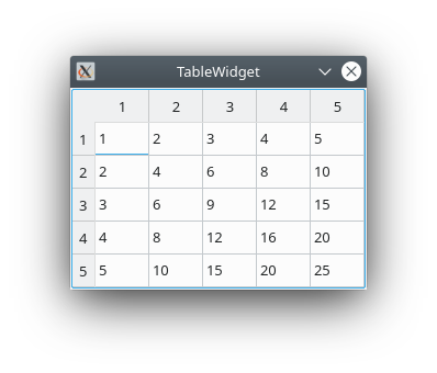 #include <QApplication> #include <QTableWidget> #include <QHeaderView> int main( int argc, char *argv[] ) { QApplication app( argc, argv ); QTableWidget table; // Größe festlegen table.setRowCount( 5 ); table.setColumnCount( 5 ); // Zellen mit Produkten als Text füllen for( int i = 0; i < table.rowCount(); i++ ) { for( int j = 0; j < table.columnCount(); j++ ) table.setItem( i, j, new QTableWidgetItem( QString::number( ( i + 1 ) * ( j + 1) ) ) ); } // Die Größe der Zellen in der Tabelle hängt vom Inhalt ab table.resizeRowsToContents(); table.resizeColumnsToContents(); // Die Tabelle soll vollständig angezeigt werden, ohne eine // Scrollbar anzuzeigen. // https://stackoverflow.com/a/37615363 // https://stackoverflow.com/a/40300974 table.setSizePolicy( QSizePolicy::Minimum, QSizePolicy::Minimum ); table.setVerticalScrollBarPolicy( Qt::ScrollBarAlwaysOff ); table.setHorizontalScrollBarPolicy( Qt::ScrollBarAlwaysOff ); table.setFixedSize( table.horizontalHeader()->length() + table.verticalHeader()->width() + table.frameWidth() * 2, table.verticalHeader()->length() + table.horizontalHeader()->height() + table.frameWidth() * 2 ); // Titel setzen und Widget anzeigen table.setWindowTitle( "TableWidget" ); table.show(); return app.exec(); }