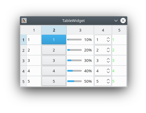 #include <QApplication> #include <QTableWidget> #include <QHeaderView> #include <QPushButton> #include <QProgressBar> #include <QSpinBox> #include <QLabel> int main( int argc, char *argv[] ) { QApplication app( argc, argv ); QTableWidget table; // Größe festlegen table.setRowCount( 5 ); table.setColumnCount( 5 ); // 1. Spalte: Zeilennummer als Text for( int i = 0; i < table.rowCount(); i++ ) table.setItem( i, 0, new QTableWidgetItem( QString::number( i + 1 ) ) ); // 2. Spalte: Zeilennummer als Button for( int i = 0; i < table.rowCount(); i++ ) table.setCellWidget( i, 1, new QPushButton( QString::number( i + 1 ) ) ); // 3. Spalte: Zeilennummer * 10 als Fortschrittsbalken for( int i = 0; i < table.rowCount(); i++ ) { QProgressBar *pBar = new QProgressBar(); pBar->setValue( ( i + 1 ) * 10 ); table.setCellWidget( i, 2, pBar ); } // 4. Spalte: ''QSpinBox'' mit Zeilennummer als Wert for( int i = 0; i < table.rowCount(); i++ ) { QSpinBox *spinBox = new QSpinBox(); spinBox->setMinimum( 0 ); spinBox->setMaximum( 100 ); spinBox->setValue( i + 1 ); table.setCellWidget( i, 3, spinBox ); } // 5. Spalte: Label mit Zeilennummer als fetter, grüner Text for( int i = 0; i < table.rowCount(); i++ ) { QLabel *label = new QLabel(); label->setText( "<b><font color=\"lightgreen\">" + QString::number( i + 1 ) + "</font></b>" ); table.setCellWidget( i, 4, label ); } // Die Größe der Zellen in der Tabelle hängt vom Inhalt ab table.resizeRowsToContents(); table.resizeColumnsToContents(); // Die Tabelle soll vollständig angezeigt werden, ohne eine // Scrollbar anzuzeigen. // https://stackoverflow.com/a/37615363 // https://stackoverflow.com/a/40300974 table.setSizePolicy( QSizePolicy::Minimum, QSizePolicy::Minimum ); table.setVerticalScrollBarPolicy( Qt::ScrollBarAlwaysOff ); table.setHorizontalScrollBarPolicy( Qt::ScrollBarAlwaysOff ); table.setFixedSize( table.horizontalHeader()->length() + table.verticalHeader()->width() + table.frameWidth() * 2, table.verticalHeader()->length() + table.horizontalHeader()->height() + table.frameWidth() * 2 ); // Titel setzen und Widget anzeigen table.setWindowTitle( "TableWidget" ); table.show(); return app.exec(); }