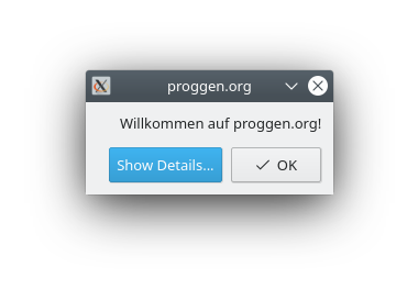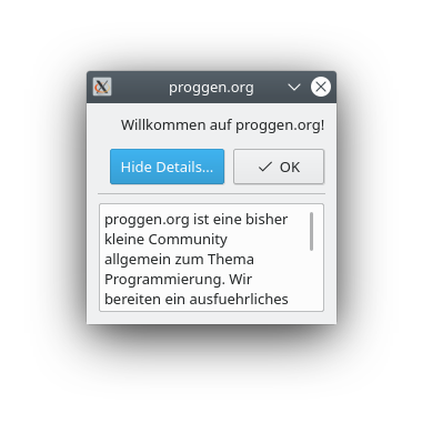 #include <QApplication> #include <QMessageBox> int main ( int argc, char *argv[] ) { QApplication app( argc, argv ); QMessageBox mBox; mBox.setWindowTitle( "proggen.org" ); mBox.addButton( QMessageBox::Ok ); mBox.setEscapeButton( QMessageBox::Ok ); mBox.setText( "Willkommen auf proggen.org!" ); mBox.setDetailedText( "proggen.org ist eine bisher kleine Community "\ "allgemein zum Thema Programmierung. Wir bereiten "\ "ein ausfuehrliches Tutorial zur Programmiersprache C " "vor, wie auch ein Tutorial zur Websprache PHP. Im "\ "Forum koennen Fragen gestellt und Projekte vorgestellt "\ "werden." ); return mBox.exec(); }