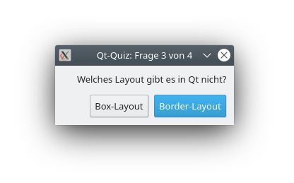 Obwohl QMessageBox eine relativ einfache Klasse ist, nimmt sie uns einiges an Arbeit ab. Man kann mit ihr auch bereits einige kleine Programme erstellen, wie zum Beispiel ein Quiz.