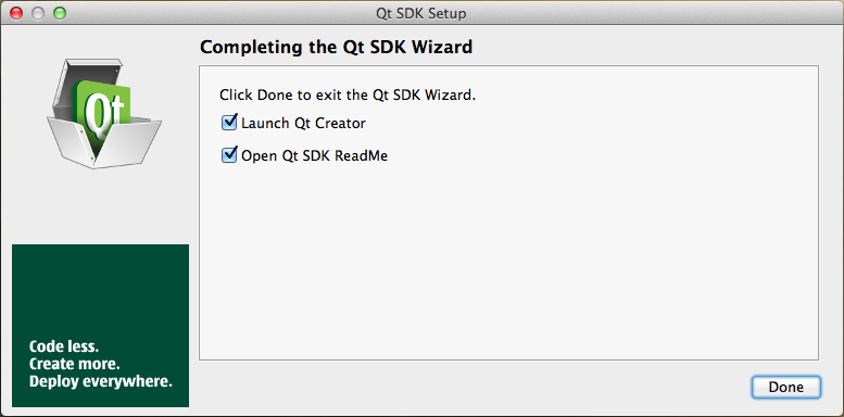 Anschließend bestätigen wir die tatsächliche Installation. Die Installation läuft eine kurze Zeit und installiert Qt Creator, Demos und Dokumentation, sowie die Kommandozeilentools. Fertig: