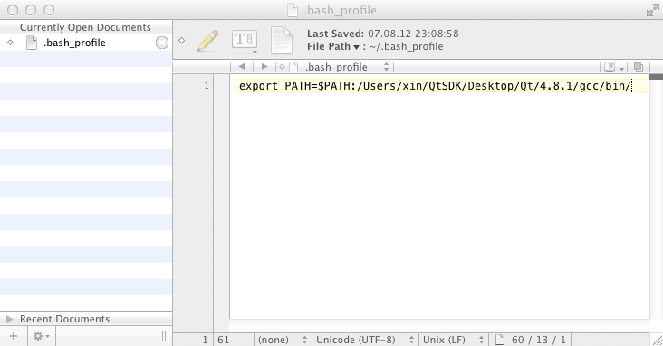 Mit einem beliebigen Editor öffnen wir die Datei .bash_profile in unserem Heimatverzeichnis und fügen folgende Zeile unten ein („/User/xin/QtSDK“ ist entsprechend eurer Wahl auszutauschen). Sollte die Datei .bash_profile noch nicht existieren, legen wir sie einfach an und schreiben nur diese eine Zeile hinein.