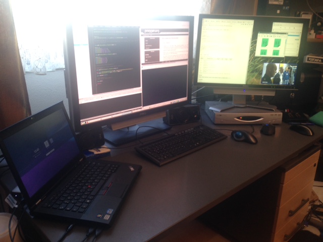 Der 30 Zoll Monitor besitzt eine Auflösung von 2560×1600 (16:10), daneben steht ein 24 Zoll Monitor mit einer Auflösung von 1920×1200 (16:10). Ich nutze meinen Computer vorrangig zum Programmieren und was immer fehlt ist Platz. Der 30„ Monitor besitzt also 4.096.000 Pixel (4 Megapixel), dazu kommt der 24“ mit 2.304.000 Pixeln (2,3 Megapixel), zusammen also 6,3 Megapixel.