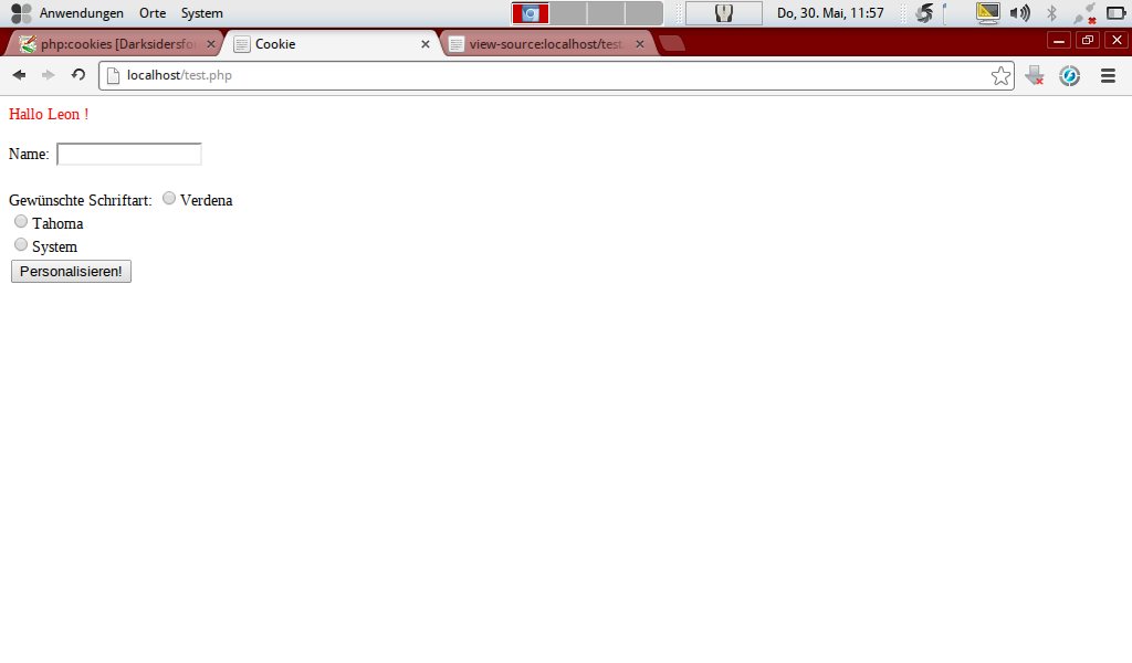 Bitte beachte, dass das Formular zweimal versendet werden muss, damit das Cookie gesetzt wird. Wenn Du die Seite ein drittes Mal aktualisierst, wird der Aktuelle Cookie ausgelesen, und der Inhalt des Dokuments erscheint in der gewünschten Veränderung.