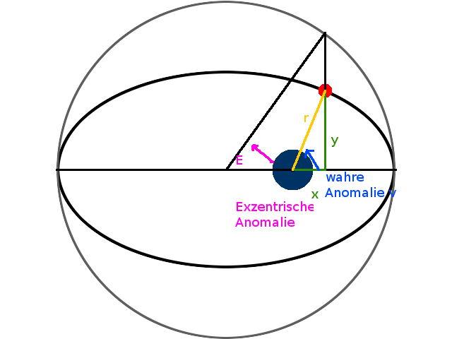 Am besten zur Beschreibung des Ortes in der Bahn ist die sogenannte wahre Anomalie geeignet. Das ist der Winkel zwischen der Verbindungsachse von nächsten (Perigäum) und fernsten (Apogäum) Punkt der Bahn und der Verbindungslinie zwischen Satellit und Zentralkörper. Sie lässt sich jedoch nur berechnen, in dem zu erst die sogenannte exzentrische Anomalie berechnet wird (wie aus exzentrischer Anomalie die wahre Anomalie wird sehen wir im nächsten Kapitel). Diese ist wiederum definiert durch den Winkel zwischen der Verbindungsachse von nächsten und fernsten Punkt der Bahn und der Verbindungslinie zwischen Ellipsenzentrum und Satellit.